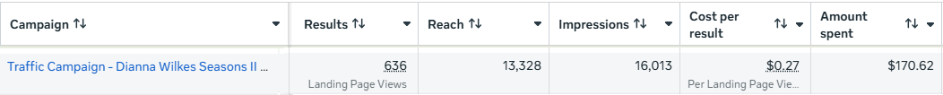 Ad budget: $170.62. Link clicks: 636. Reach: 13,328. Impressions: 16,013.