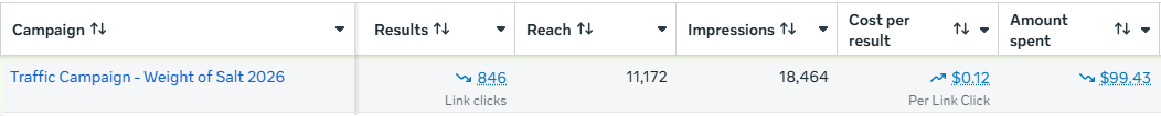 Ad budget: $99.43. Link clicks: 846. Reach: 11,172. Impressions: 18,464.